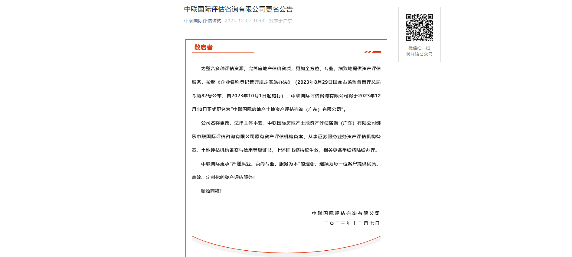 中聯(lián)國(guó)際評(píng)估咨詢有限公司于2023年12月10日正式更名為“中聯(lián)國(guó)際房地產(chǎn)土地資產(chǎn)評(píng)估咨詢(廣東)有限公司”...